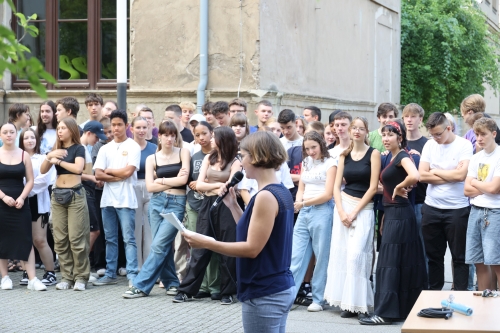21.08.2023 - Am 21.8. ging es sonnig zunächst in den Klassen und kurz vor der Hofpause auch gemeinsam auf dem Hof für unsere Schulgemeinschaft los. Und erwartet ein neues Schuljahr mit Theater, dt.-frz. Schüleraustausch (an die Jüngeren: macht Euch schlau!), Sportfest, Wettbewerben, Projekten, Prüfungen und ganz viel Unterricht.