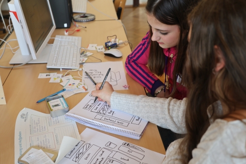 Nach der Findungsphase ging es ans Tüfteln und die Lösungssuche. Start in die Umsetzung der eigenen Idee. Ein Prototyp soll entstehen, der zwar nicht perfekt ist, aber funktioniert. Toll, dass sich diesmal auch viele Mädchen einbringen und mitmachen. Ist ja bei dem Thema nicht selbstverständlich ;-) (hiermit genug zum "Klischee"). Auch jahrgangsübergreifend wurde in den Gruppen gearbeitet und sich gegenseitig geholfen.