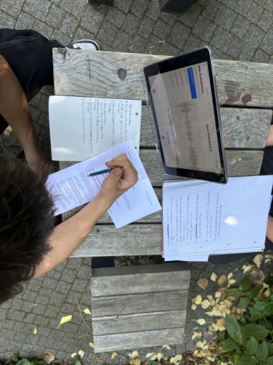 09.06.2023 - Statt auf der Südseite im warmen Klassenzimmer zu schwitzen ging es zum Sprache lernen raus. Dank WLAN und M.I.T.-iPads (Link2 M.I.T.) war dies sogar mit Techniknutzung möglich. Angeleitet von Herrn Lange sollten die Dialoge auf dem iPad eingesprochen werden.
